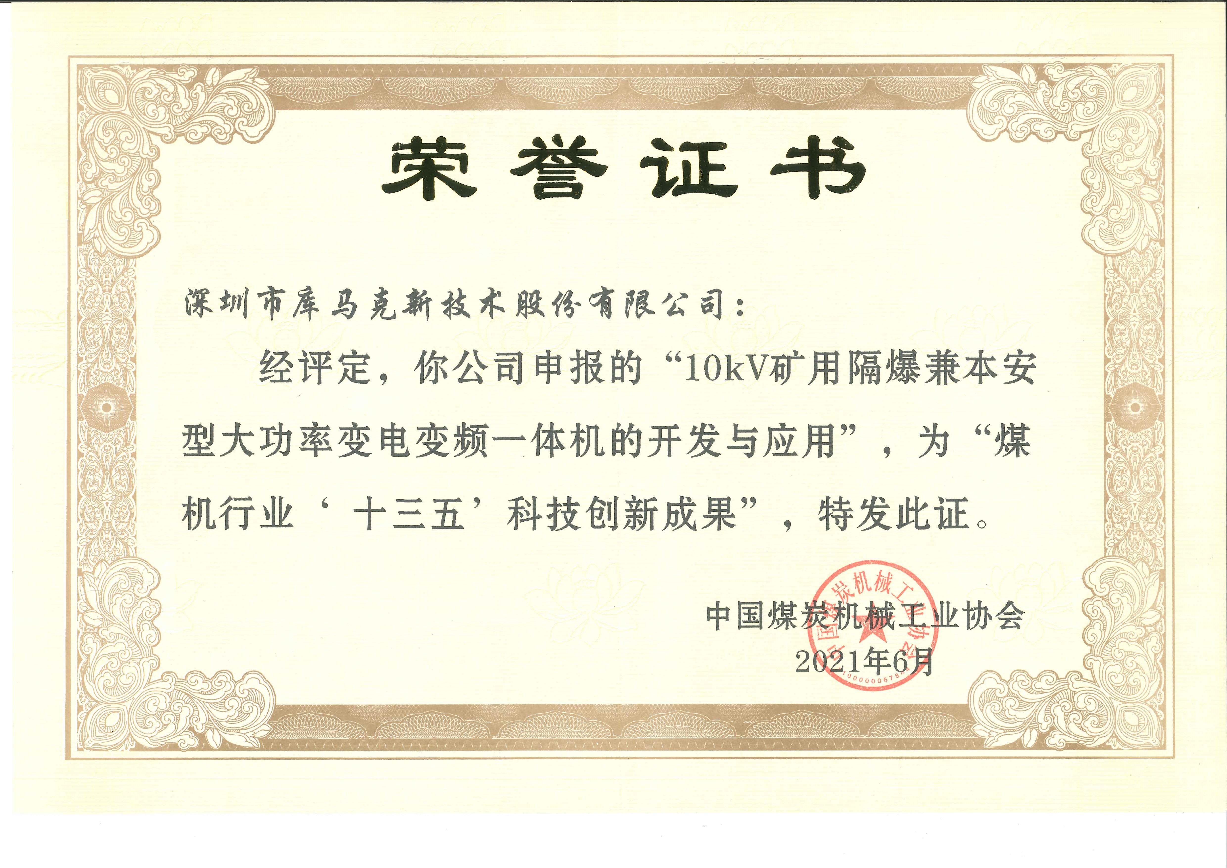 2021年6月 ,庫馬克 榮獲“10kV礦用隔爆兼本安型大功率變電變頻一體機的開發(fā)與應(yīng)用”,為“煤機行業(yè)‘十三五’科技創(chuàng)新成果”。
