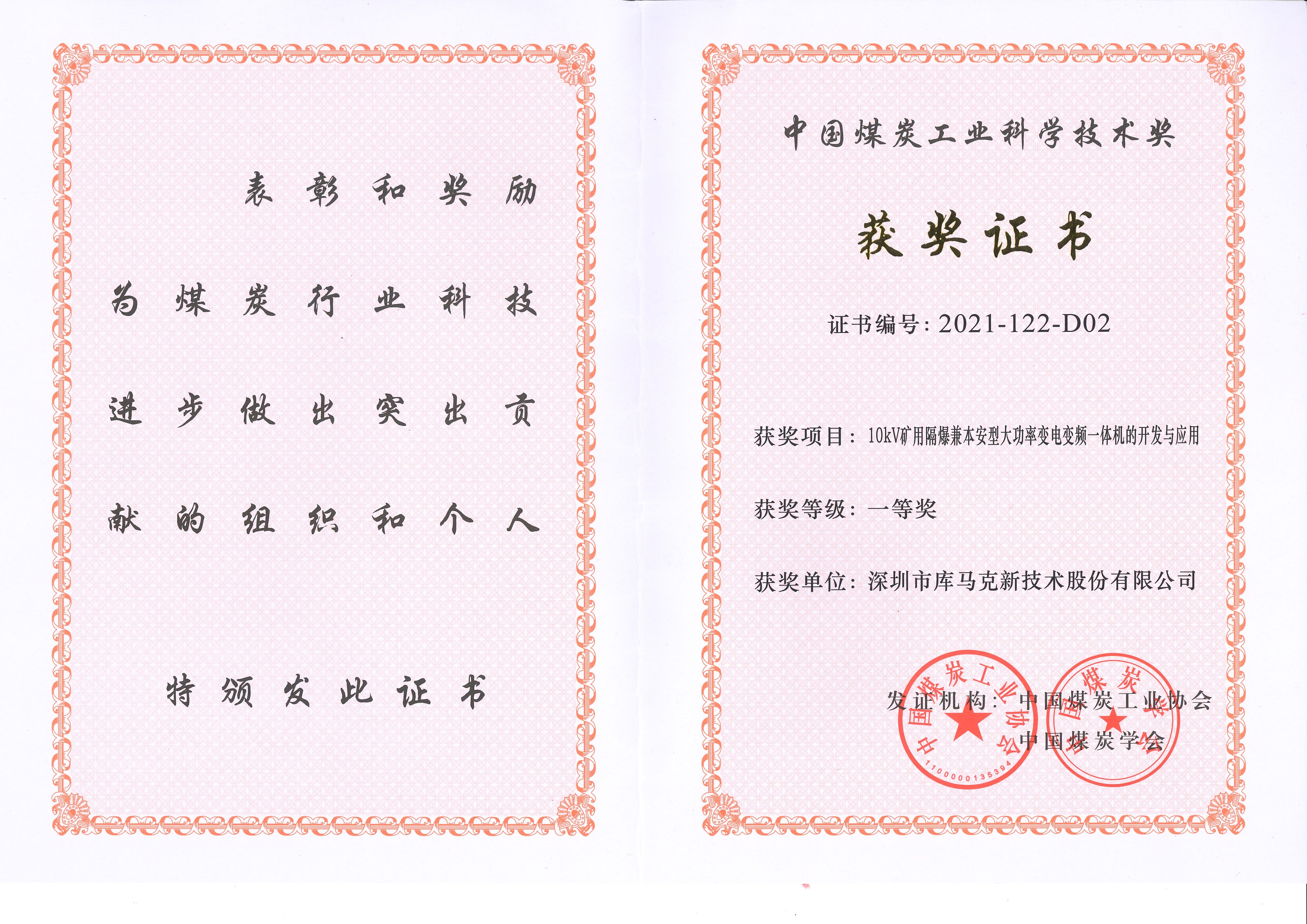 根據(jù)中國煤炭工業(yè)協(xié)會公示2021年度中國煤炭工業(yè)科學(xué)技術(shù)獎的評審:深圳庫馬克10kV礦用隔爆兼本安型大功率變電變頻一體機的開發(fā)與應(yīng)用榮獲“中國煤炭工業(yè)科學(xué)技術(shù)一等獎”。